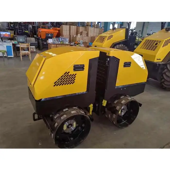 Key features include high operating efficiency, compact size for easy maneuverability, double drum design, powerful 8 kW engine, and adjustable travel speed.