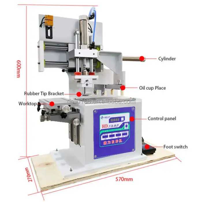 The dimensions of the Mini Pad Printing Machine are 560mm (L) x 450mm (W) x 600mm (H).