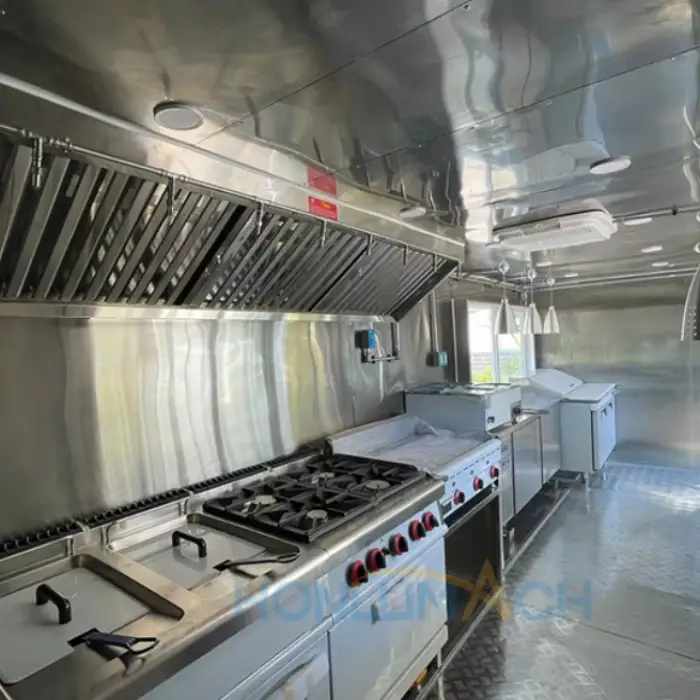 Cooking equipment is customizable. You can choose the configuration (grills, fryers, ovens, burners, etc.) to match your menu — ask the supplier for layout and equipment packages.