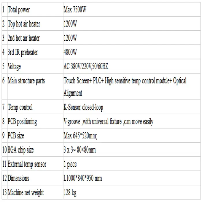 Key features include a robust metal design, high power output of 7.75 kW, an easy-to-operate welding head, and suitability for SMD and PCB repairs.