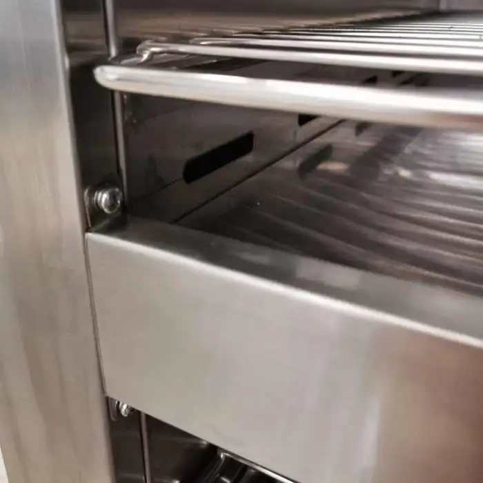 The cabinet is constructed from three-layer 304 stainless steel for durability, corrosion resistance, and easy cleaning.