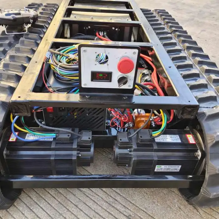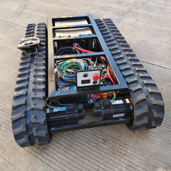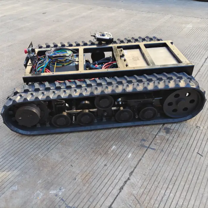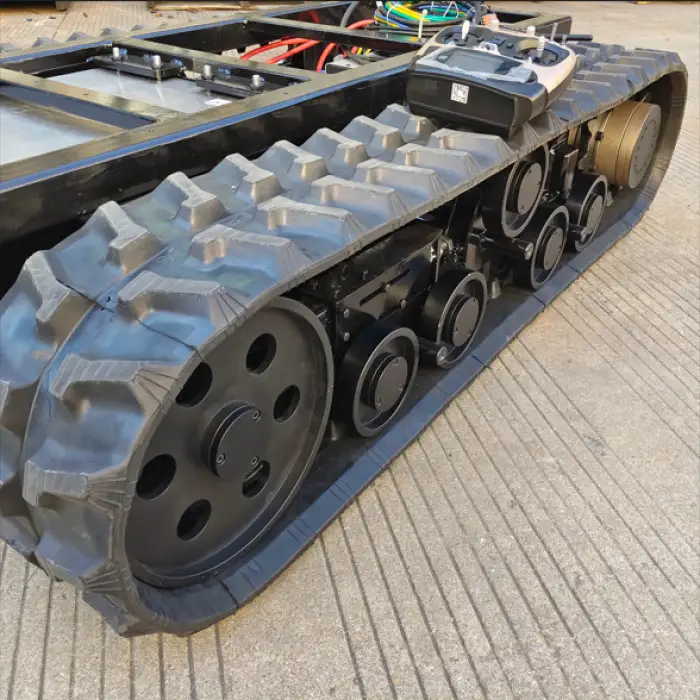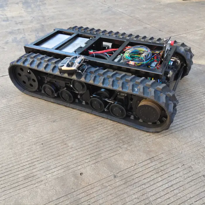 The rubber crawlers provide excellent traction, allowing the chassis to operate on various terrains, including rough and uneven surfaces.