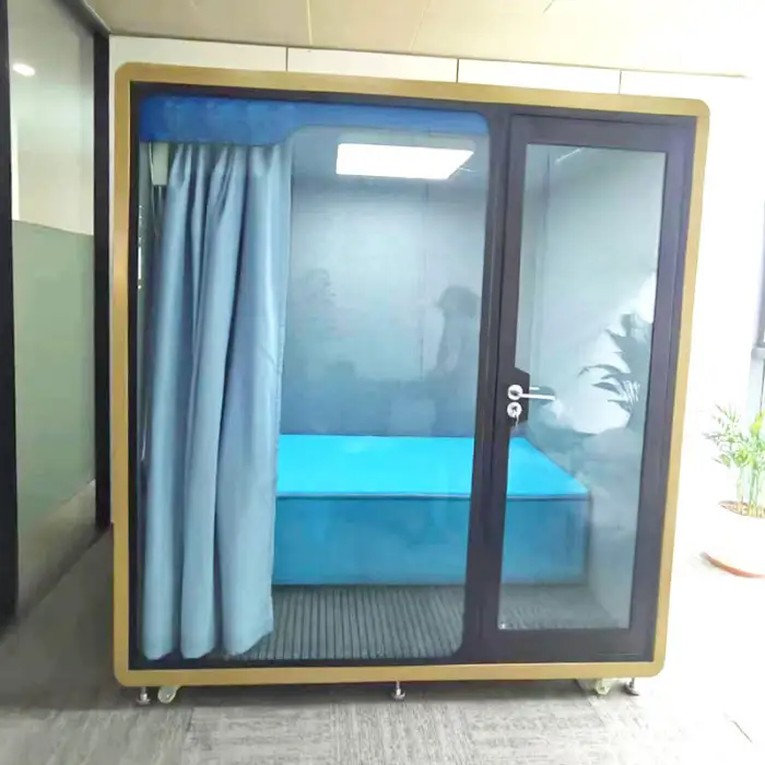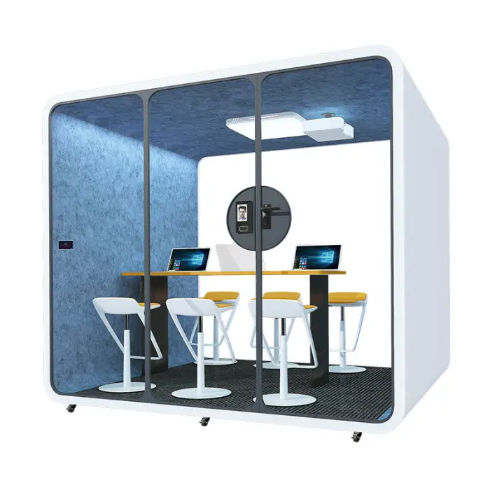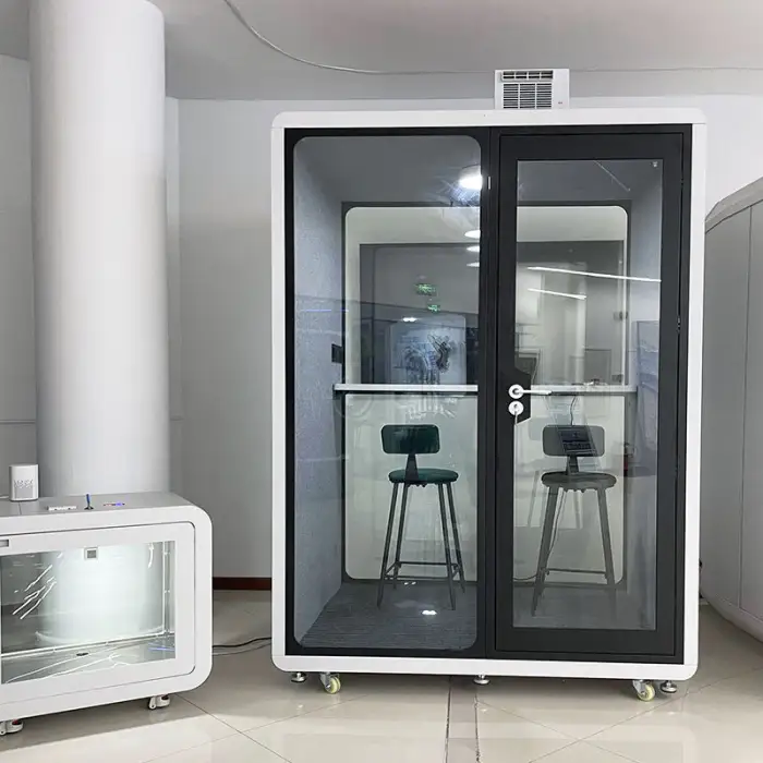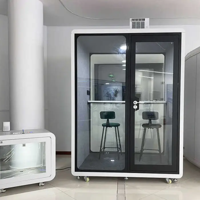 The pod utilizes advanced soundproof materials and double-layer glass to effectively block external noise.