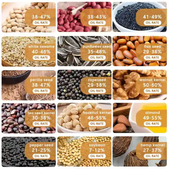 The 1-5t Double Screw Oil Press Machine can process a variety of seeds and nuts including sunflower, coconut, palm, sesame, and olive.