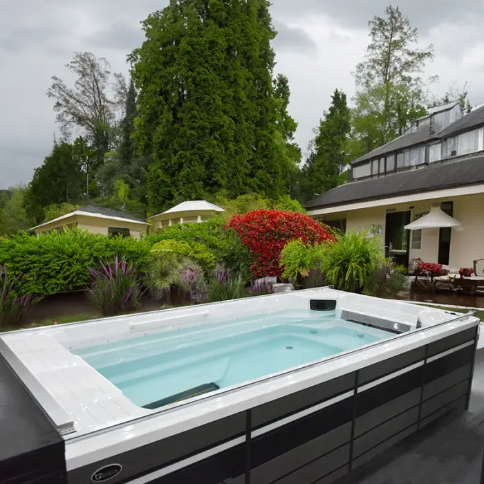 2. What materials are used in the construction of this swimming pool surf swim spa?