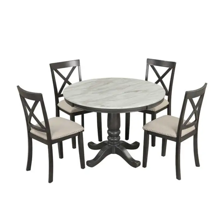 The dining table features a stylish round shape, making it ideal for space-saving and casual dining.