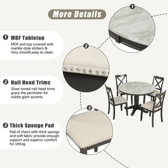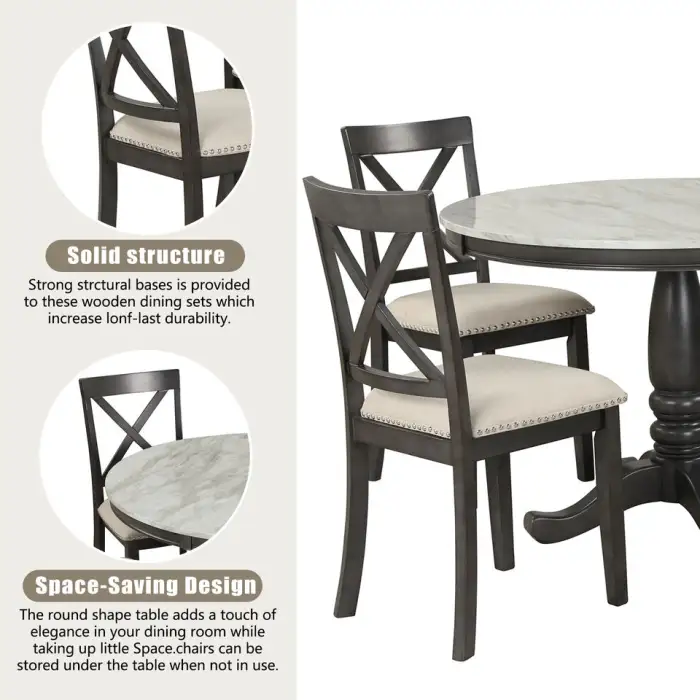 The set is made from solid wood with a faux marble top for the table and upholstered chairs for comfort.