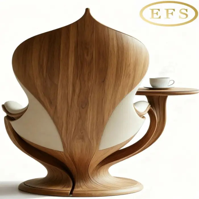 The chair is made with eco-friendly materials, including premium soft fabric for the upholstery, high-density foam for filling, and a solid wood/bentwood curved sculpted frame.