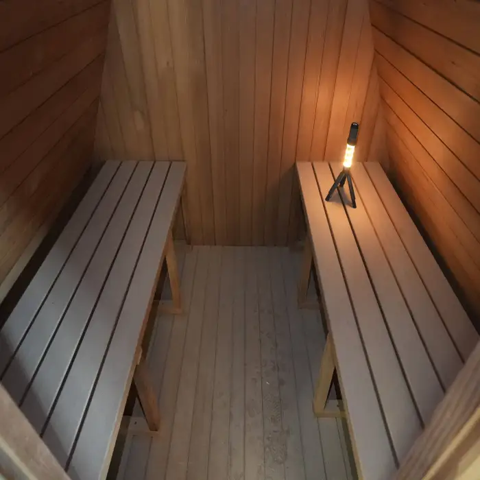This sauna features a wood-burning heater, providing a traditional sauna experience without the need for electricity.