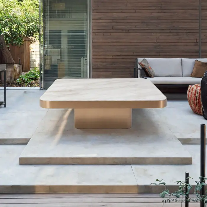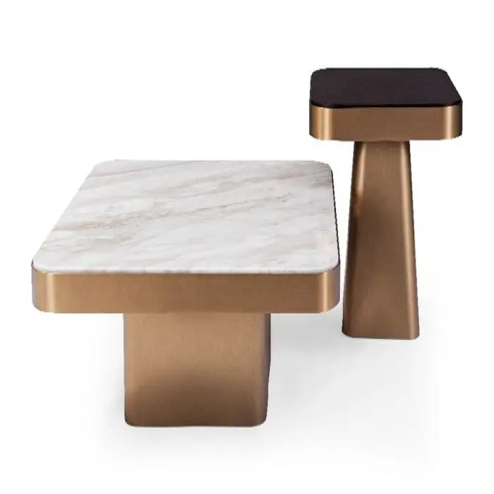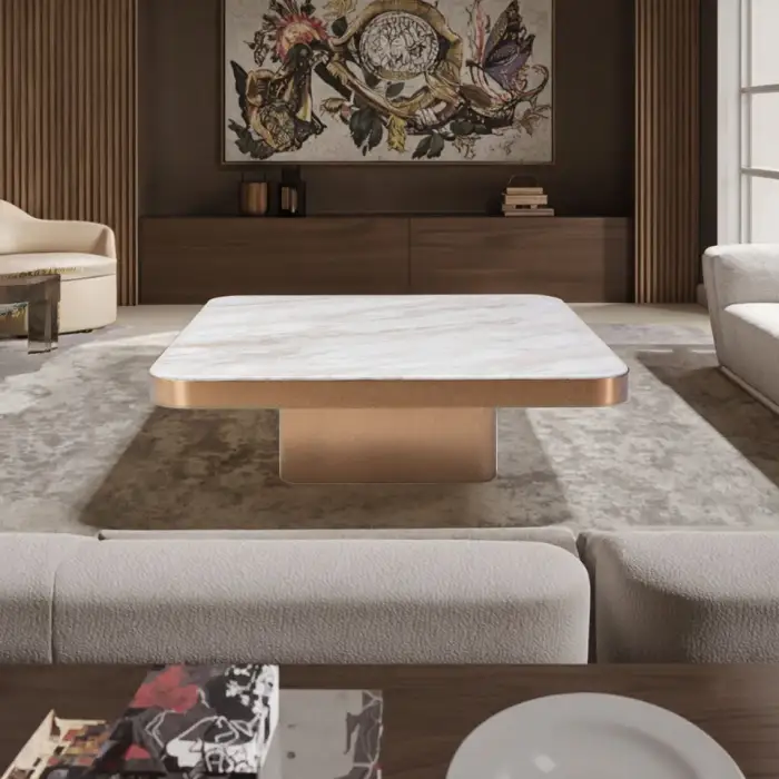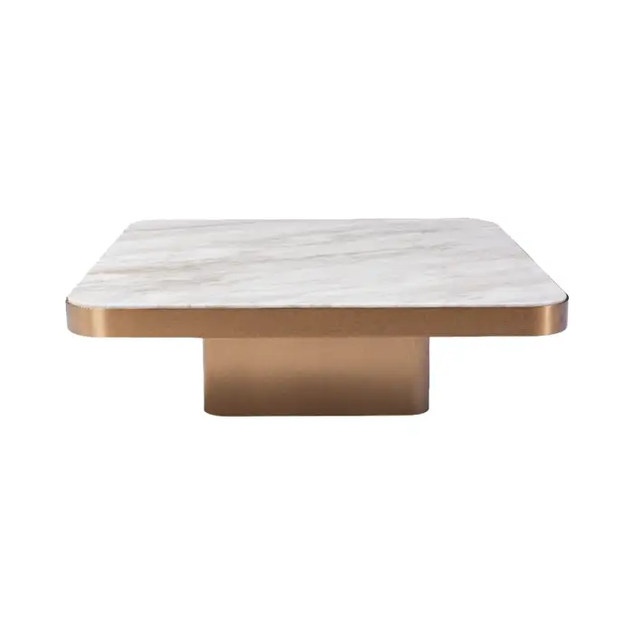 The coffee table features a durable stainless steel frame and an elegant white marble top.