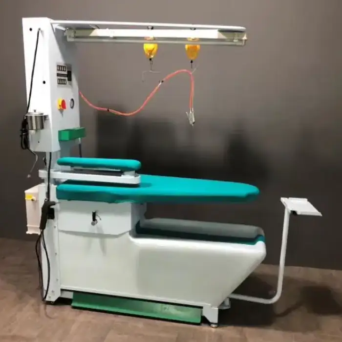 It is an industrial vacuum cleaner and spotting table machine designed for fabric cleaning in commercial and industrial settings. It combines powerful suction with a vapor cleaning process to remove dirt, dust and spots from textiles, upholstery and garments.