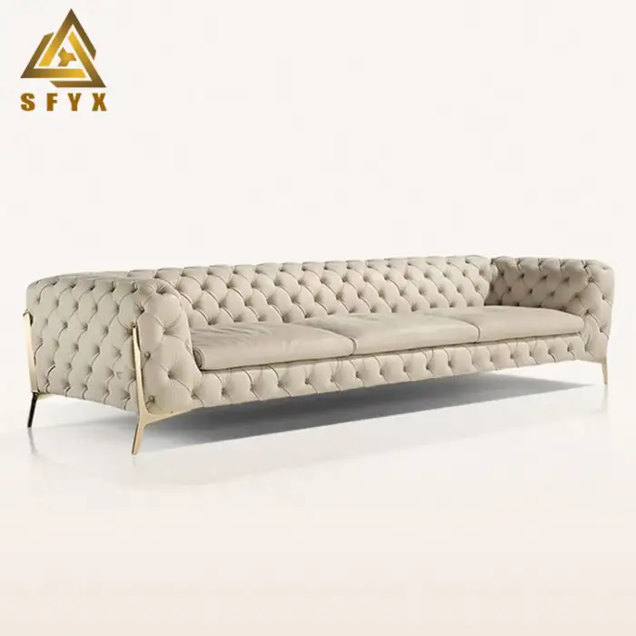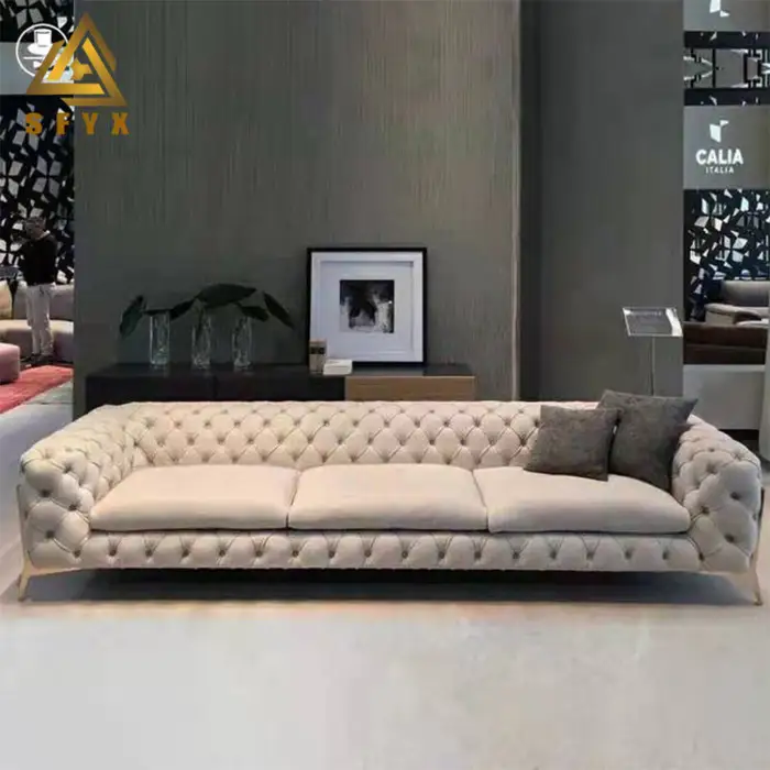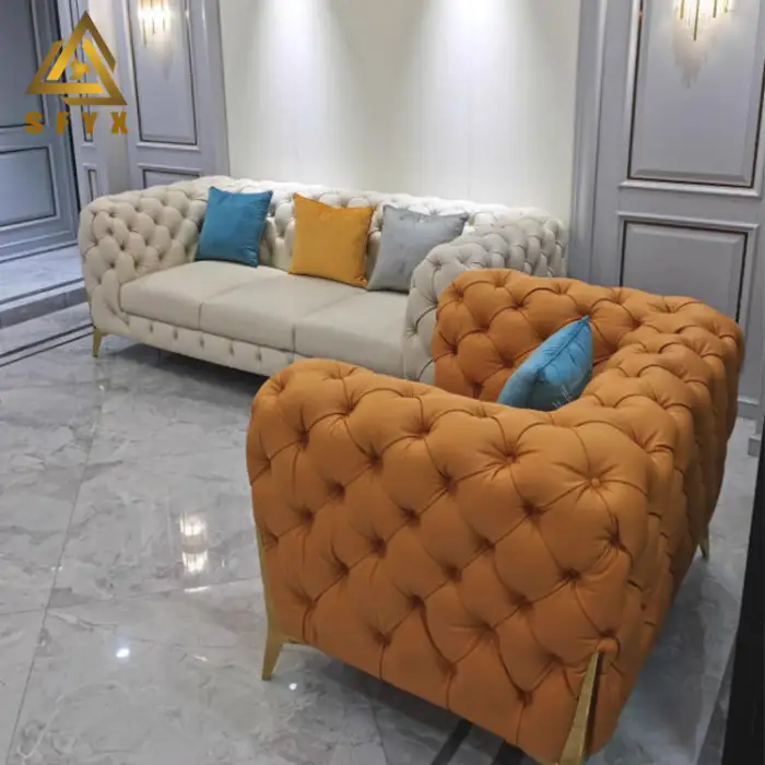 The sofa features a modern design style with Chesterfield influences, highlighted by its tufted detailing.