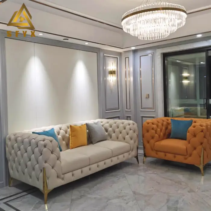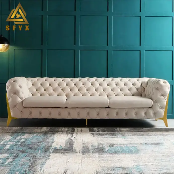The sofa is made with high-quality velvet fabric and features gold stainless steel legs for a modern and elegant look.