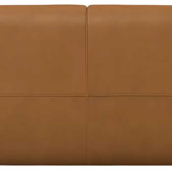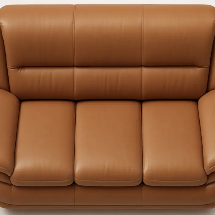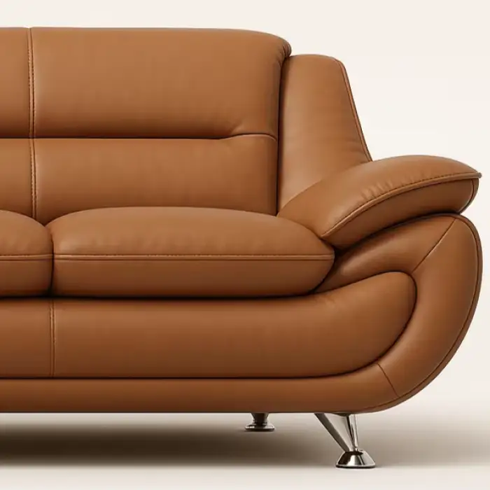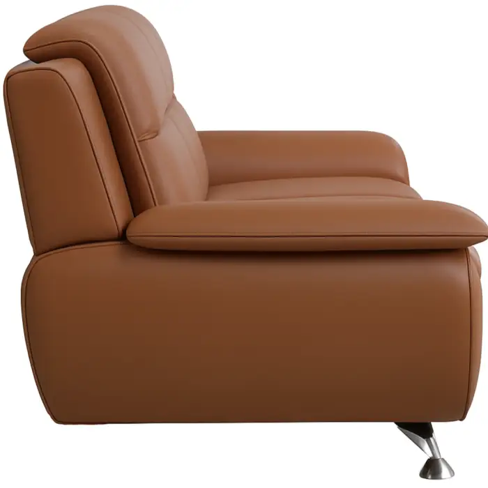 The sofa is made from top-grain genuine leather, high-resilience foam, and features polished stainless steel legs.