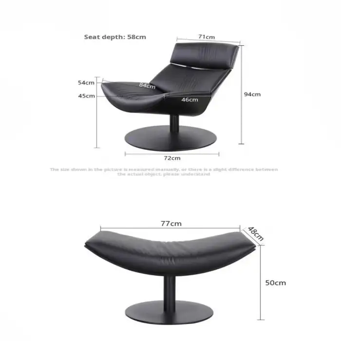 The chair features a leather cover, a solid wood and plywood frame, and metal legs, providing durability and style.