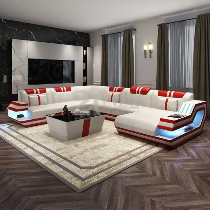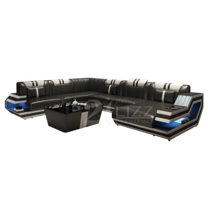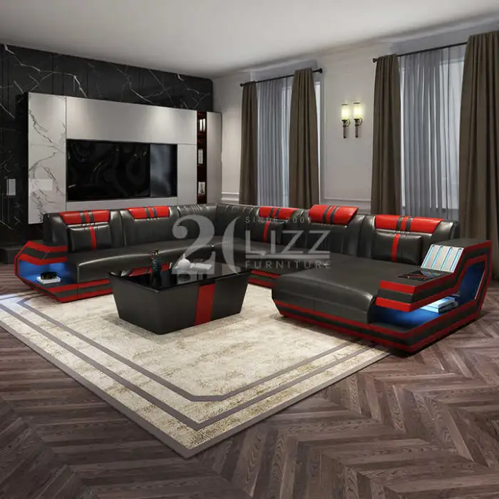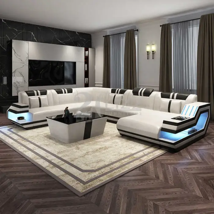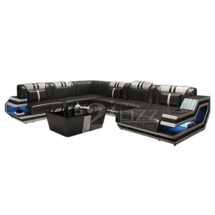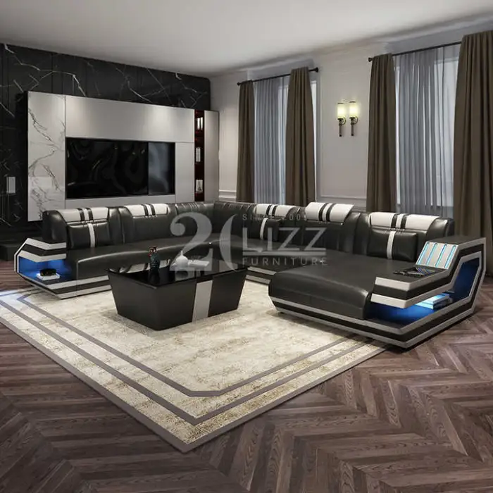 The Modern Living Room Furniture Italian Genuine Leather Sofa U-shape Black Leather Sectional is the perfect centerpiece for your living space. This stylish sofa combines comfort and elegance. Made from high-quality Italian genuine leather, it offers a luxurious feel while being durable and easy to maintain. Its U-shape design provides ample seating for family and friends, making it ideal for gatherings and relaxation.