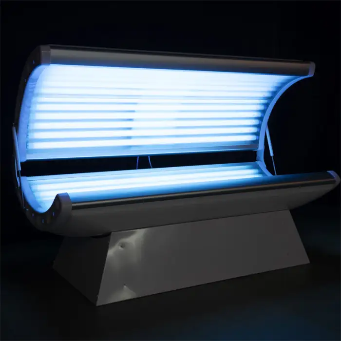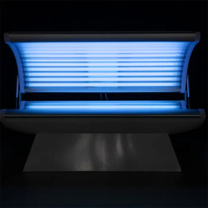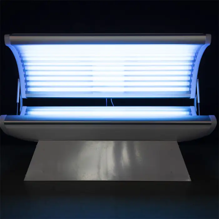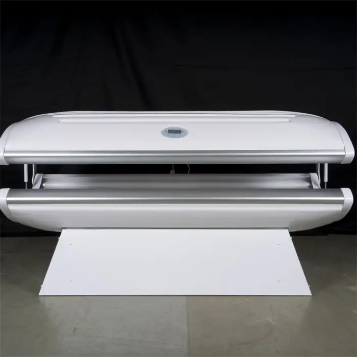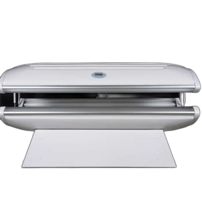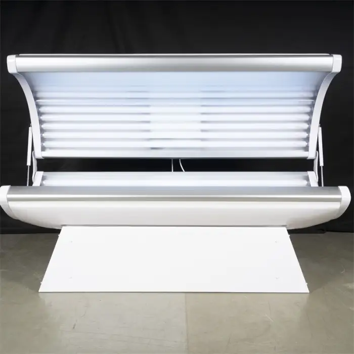 It is a commercial horizontal (lay‑down) tanning bed with a double solarium design that uses UV bronzing technology to deliver even tanning for the body, face and bikini/intimate areas. It’s intended for salons, spas, fitness centers or personal use where professional tanning services are offered.