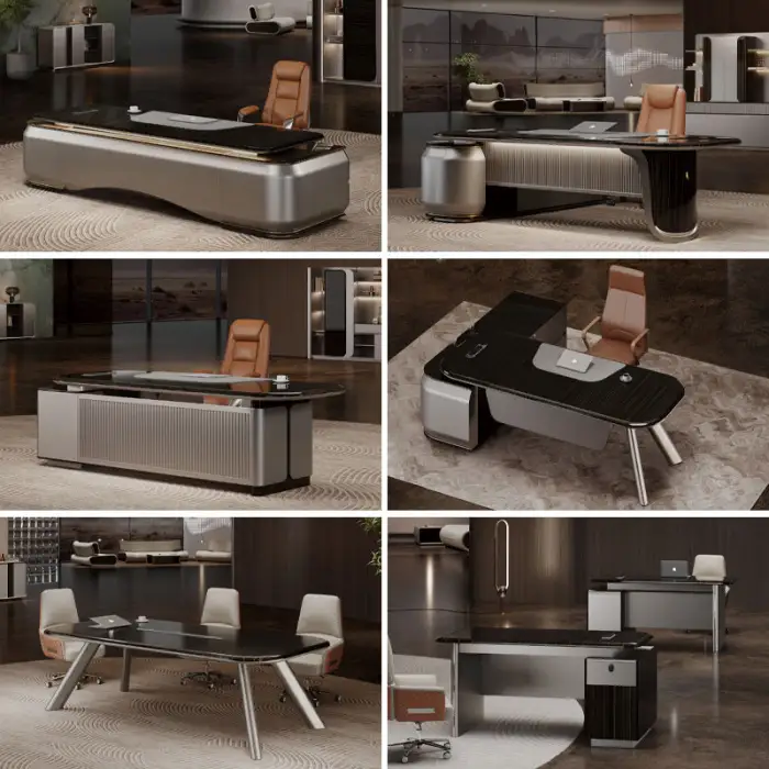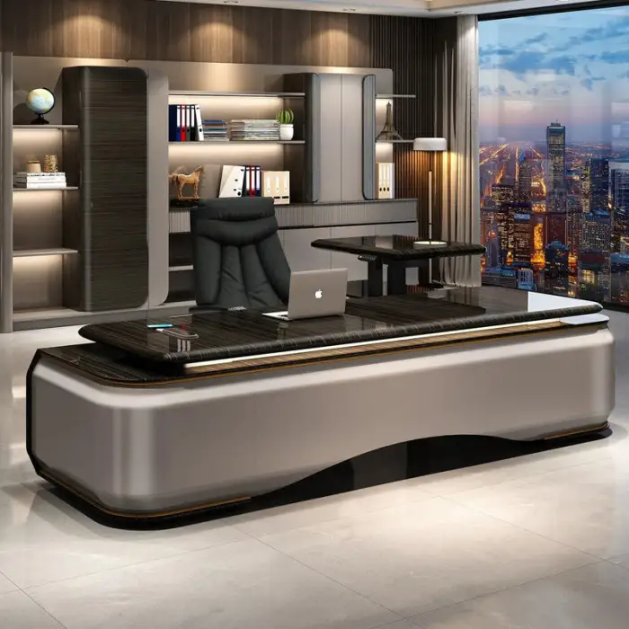 The desk features a modern design with a luxurious aesthetic, making it ideal for executive office settings.