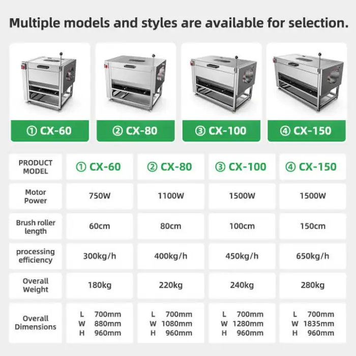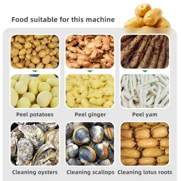 The machine is suitable for cleaning and peeling a variety of foods, including potatoes, lotus root, ginger, taro, yam, and cassava.