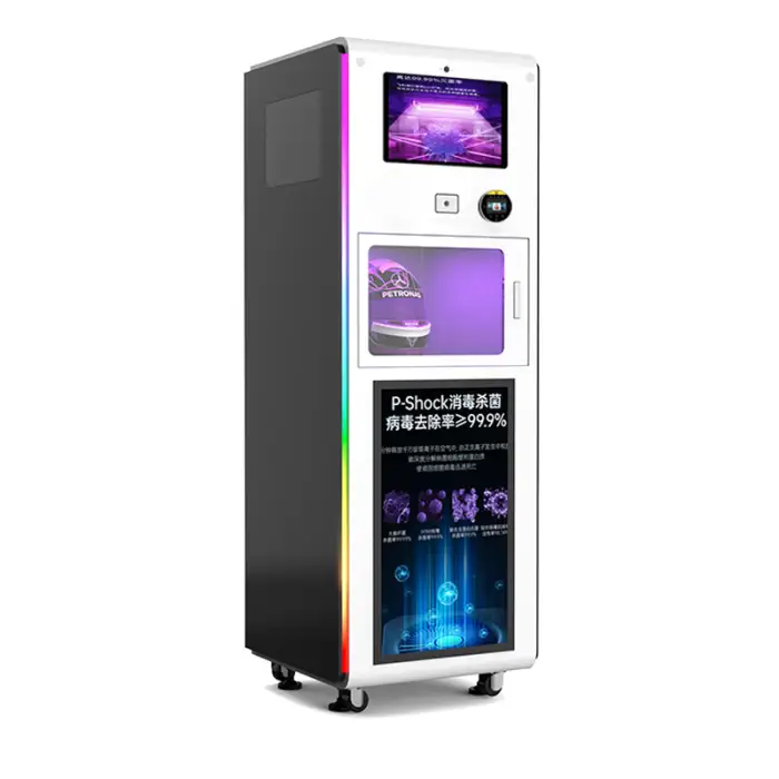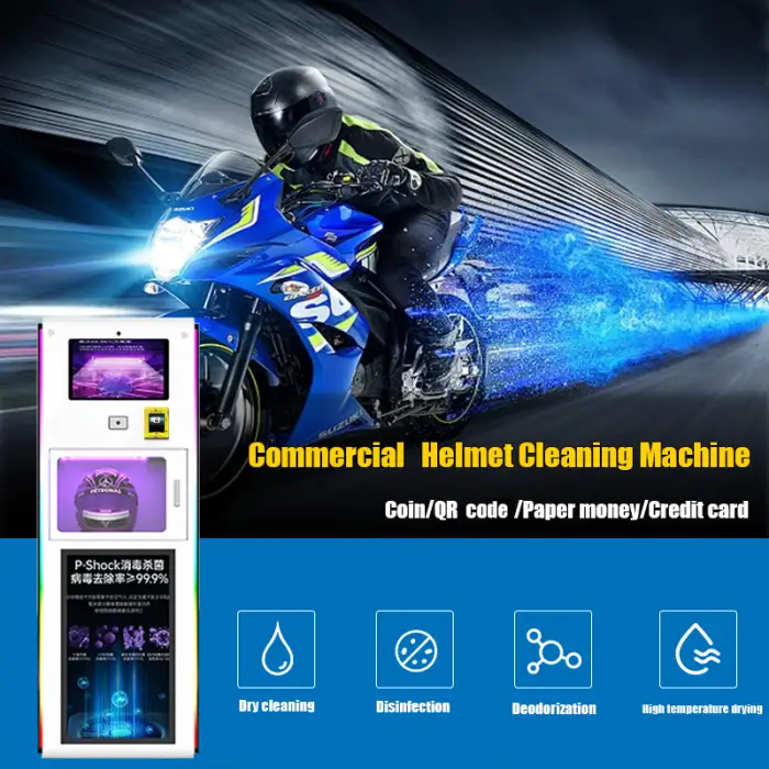 The Motorcycle Helmet Vendo Machine is an automatic cleaning machine designed to dry clean and deodorize motorcycle helmets quickly, making it ideal for busy public spaces.