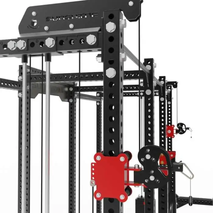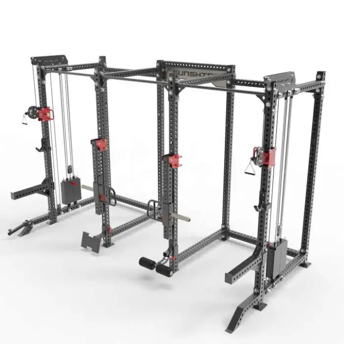 This gym rack allows for a variety of workouts including bodybuilding, strength training, and rehabilitation exercises with its high and low pulley systems.