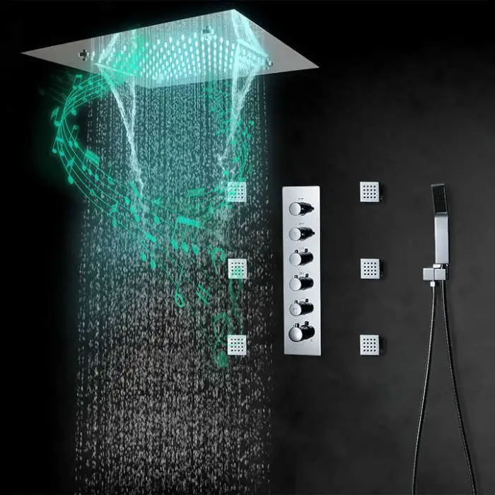 The showerhead features multiple spray patterns including Rain, Soft, Pause, Jet, and Massage.