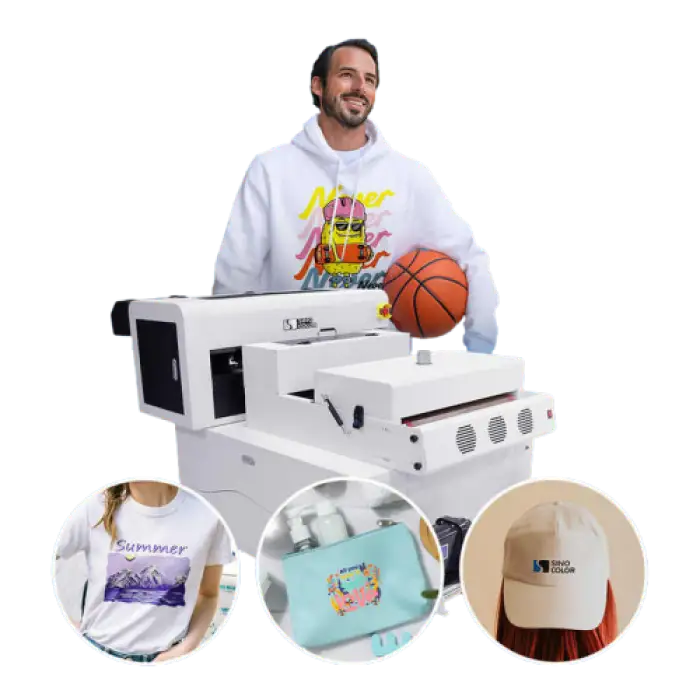 The DTF Inkjet Printer can print on a variety of fabrics including T-shirts, hoodies, caps, bags, and more.
