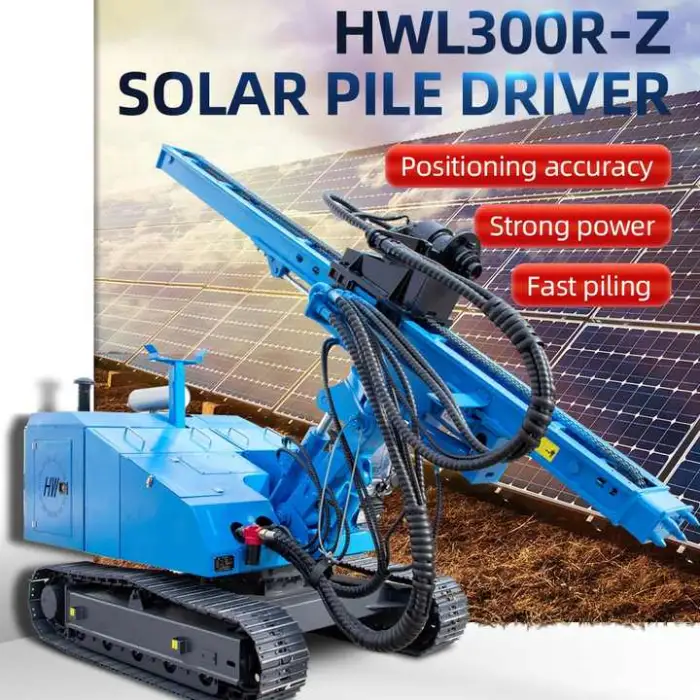 This machine is designed to drive both hammer piles and screw piles for ground-mounted solar panel installations and other foundation works, making solar farm and renewable-energy construction faster and more efficient.