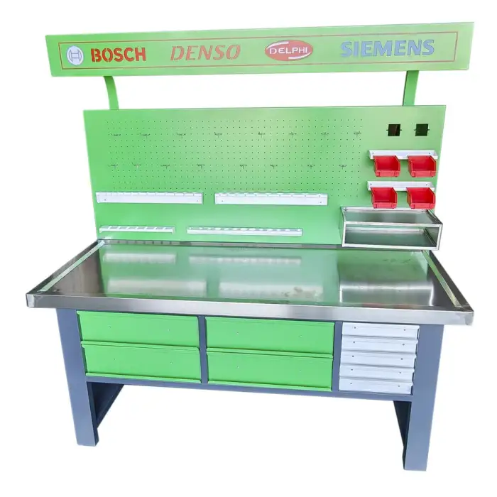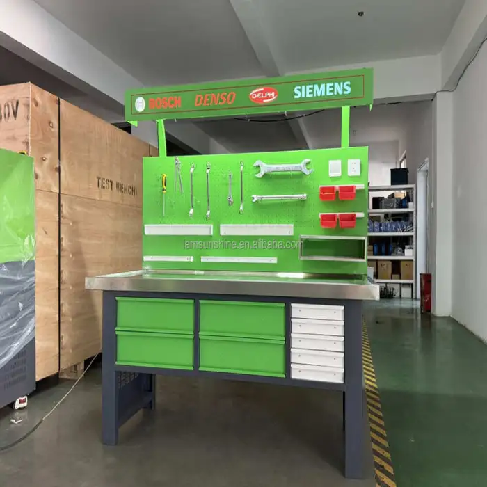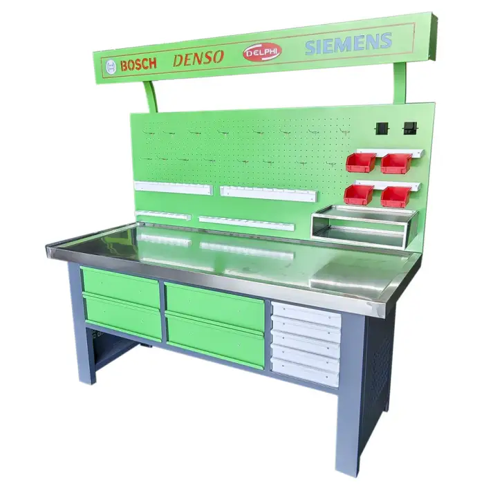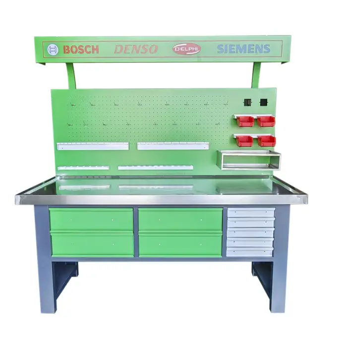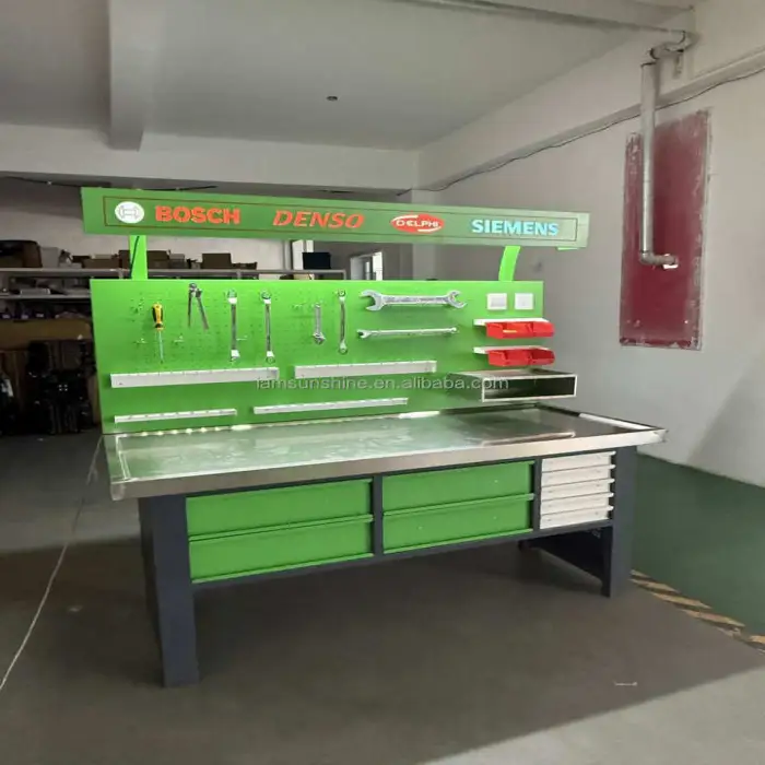 The workbench is constructed from durable materials designed for long-lasting use in automotive repair environments.