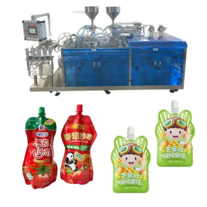 This machine is versatile and can package various liquid products including honey, sauces, beverages, and cheese.