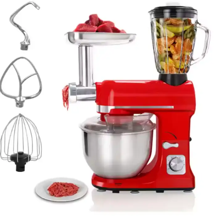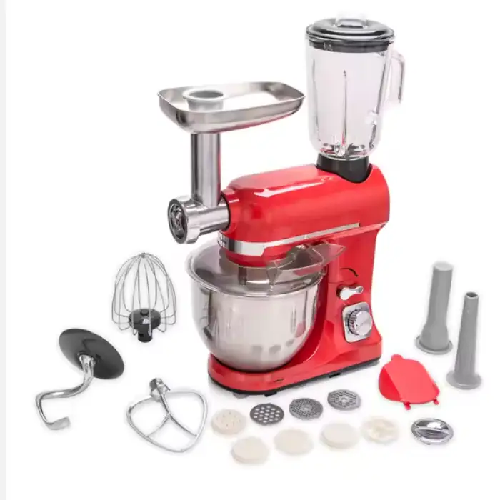 The blender comes with a dough hook, flat beater, mixing bowl, pouring shield, juice cup, and a built-in meat grinder.