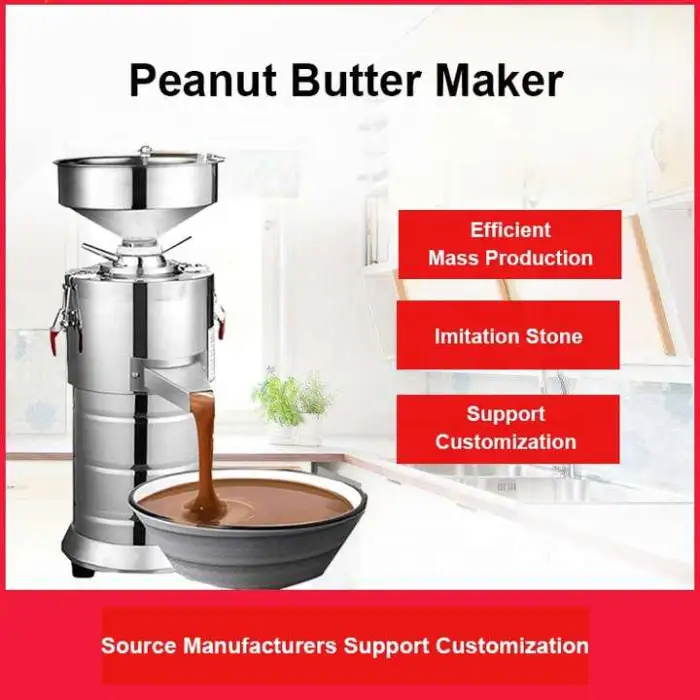 This machine is designed to handle a variety of raw materials, specifically peanuts for peanut butter and cocoa for grinding, among others.