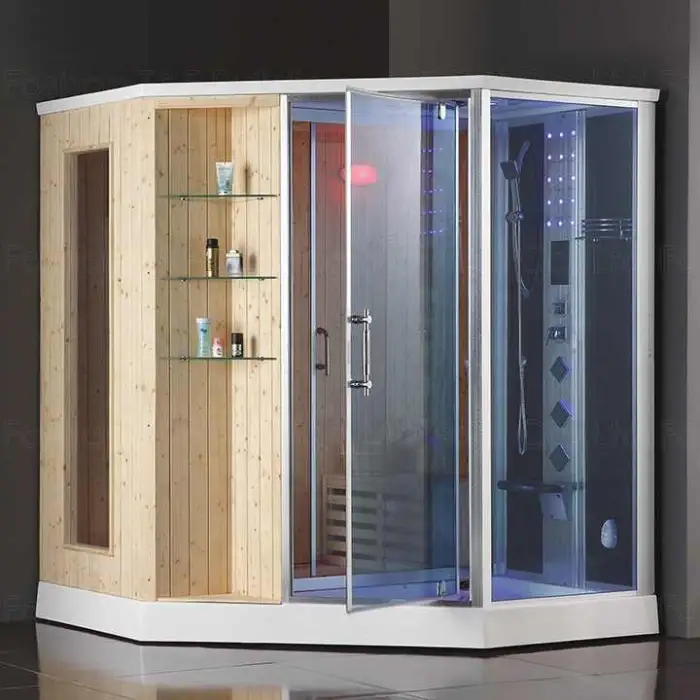 The product combines dry sauna and wet steam functions, features a computer control panel for easy operation, is made of solid wood for a beautiful minimalist design, and includes transom windows for natural light and a spacious feel.