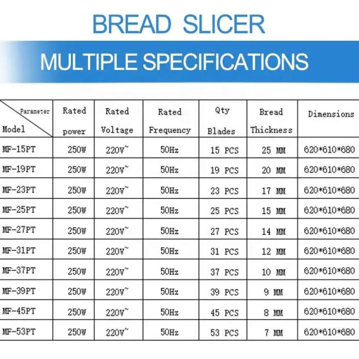 The bread slicer has a power rating of 250W, ensuring efficient slicing performance.