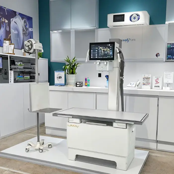 The machine supports various applications including animal health diagnosis, routine check-ups, pre-surgical imaging, and research in veterinary studies.