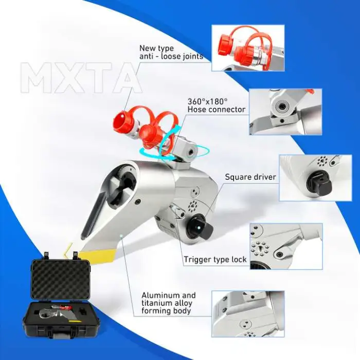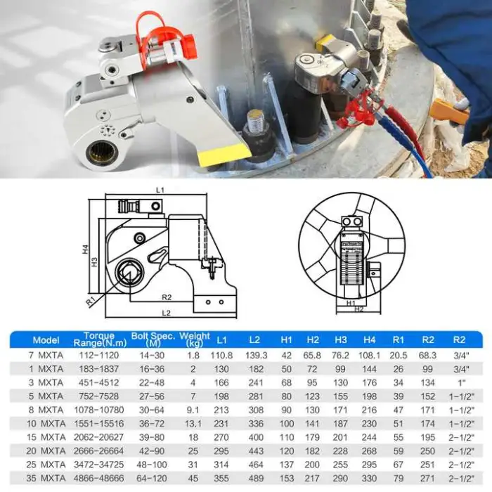 The MXTA is a hydraulic torque wrench that operates with manual adjustments.