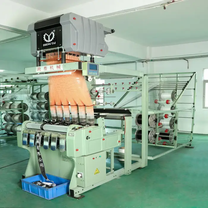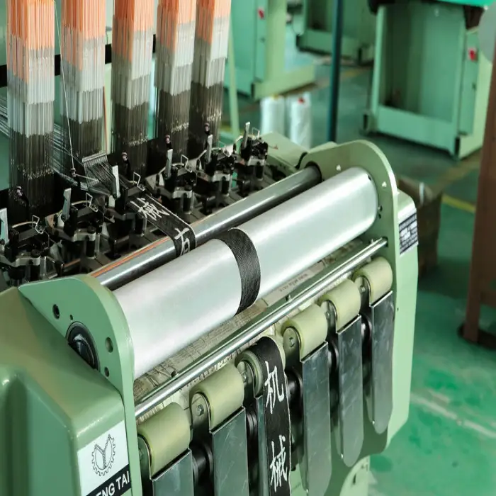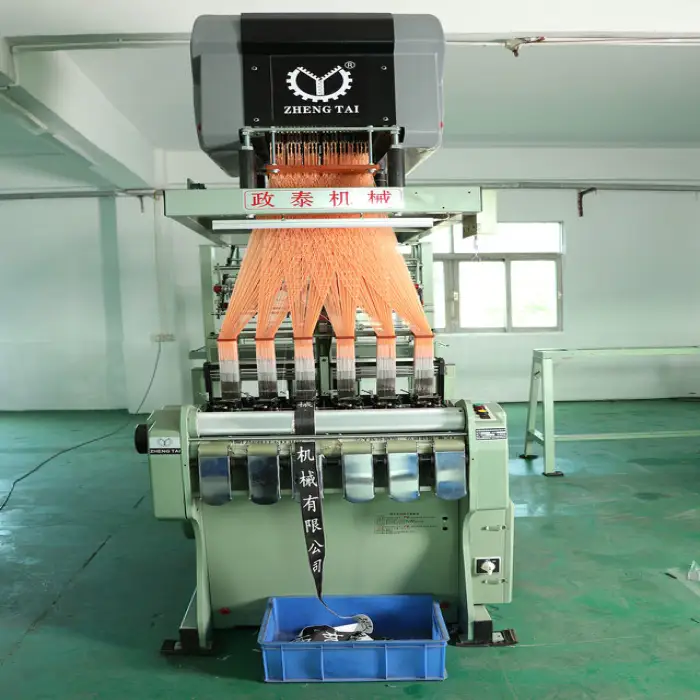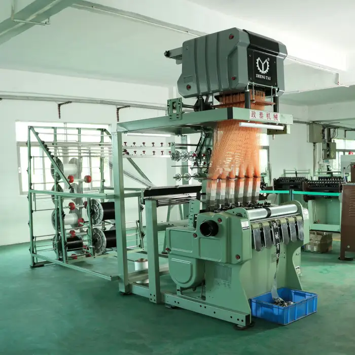 The machine can weave both elastic and inelastic jacquard webbing, making it suitable for various textile applications.