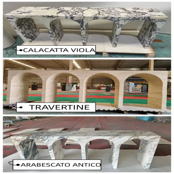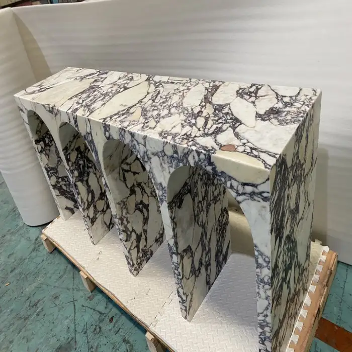 The console table features Italian Calacatta Viola marble, known for its high quality and craftsmanship.
