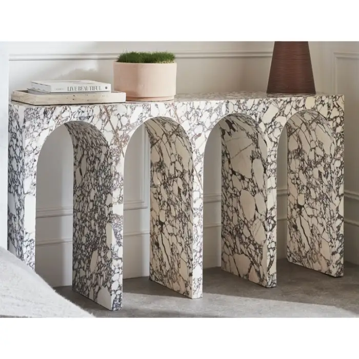 The top of the console table is made from beautiful Italian Calacatta Viola marble.
