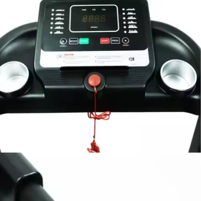 The treadmill is equipped with an LED screen display that tracks speed, distance, time, and calories burned.