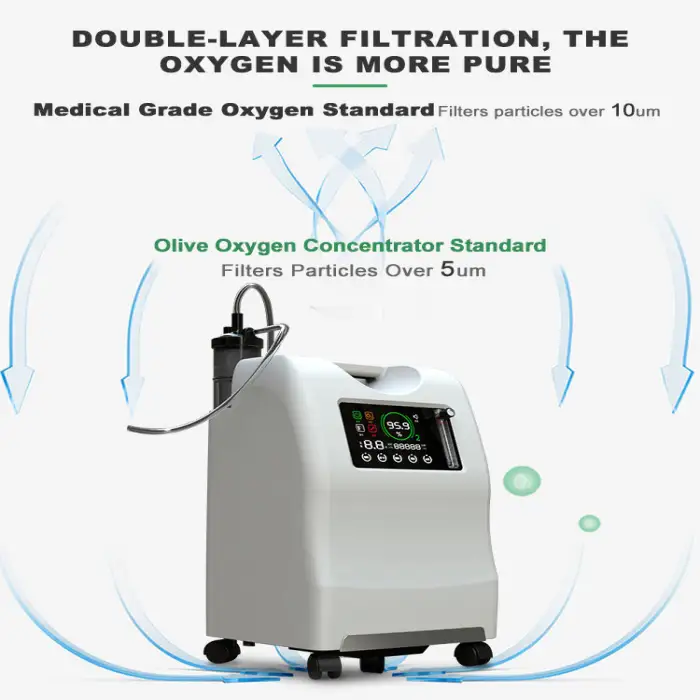 The Olive Medical Portable Oxygen Machine is available in different models with various flow rates: OLV-3A provides 3L/min, OLV-5A provides 5L/min, OLV-8A provides 8L/min, and OLV-10 provides 10L/min.