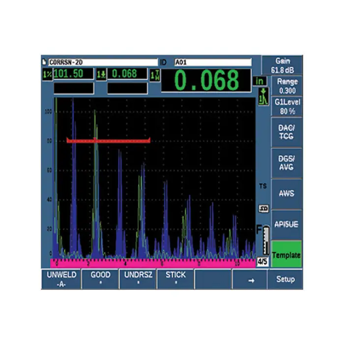 The Olympus EPOCH 650 uses ultrasonic detection in A-scan mode to identify weld flaws in metal structures.