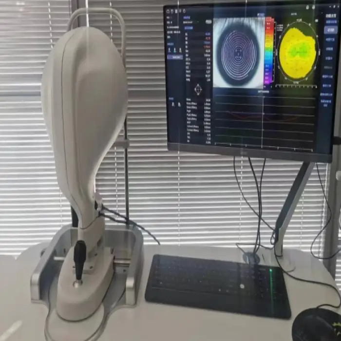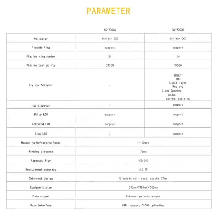 The SK-7000B is a 3-in-1 electric chin rest corneal topography machine designed for ophthalmic medical use. It provides high-resolution corneal maps and diagnostic imaging to aid eye care professionals in evaluating corneal shape, detecting conditions like astigmatism, and assisting surgical planning.