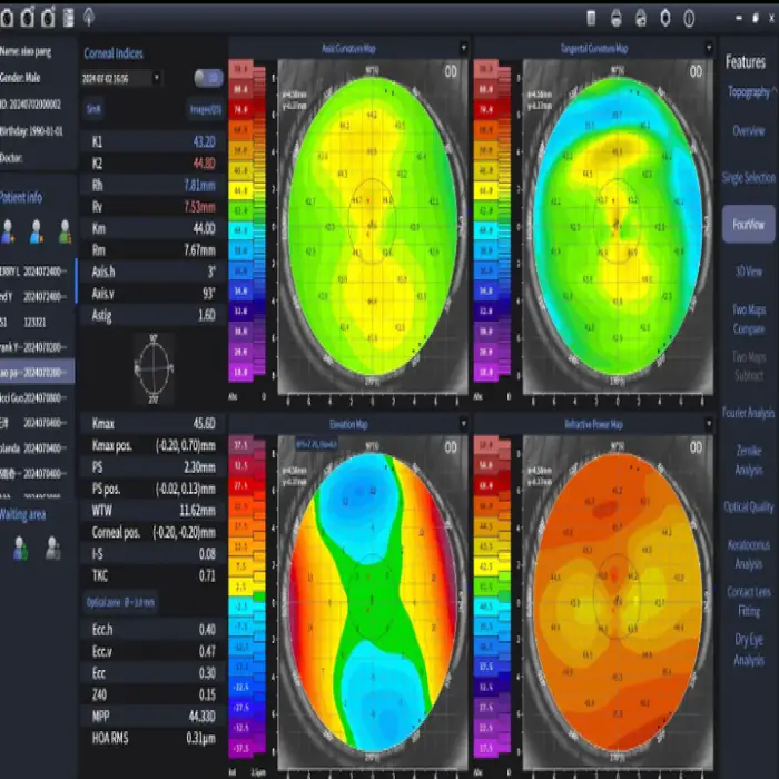 Export formats and connectivity depend on the supplied software package. Many corneal topographers offer common image formats (e.g., JPG/PNG) and network or USB export; some models support DICOM or CSV. Confirm supported formats and interfaces with the vendor or check the product manual.
