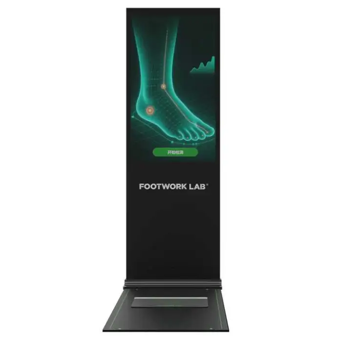 The machine performs high-resolution 3D foot scans and dynamic gait analysis to create personalized orthotic insole designs that improve walking mechanics and posture.