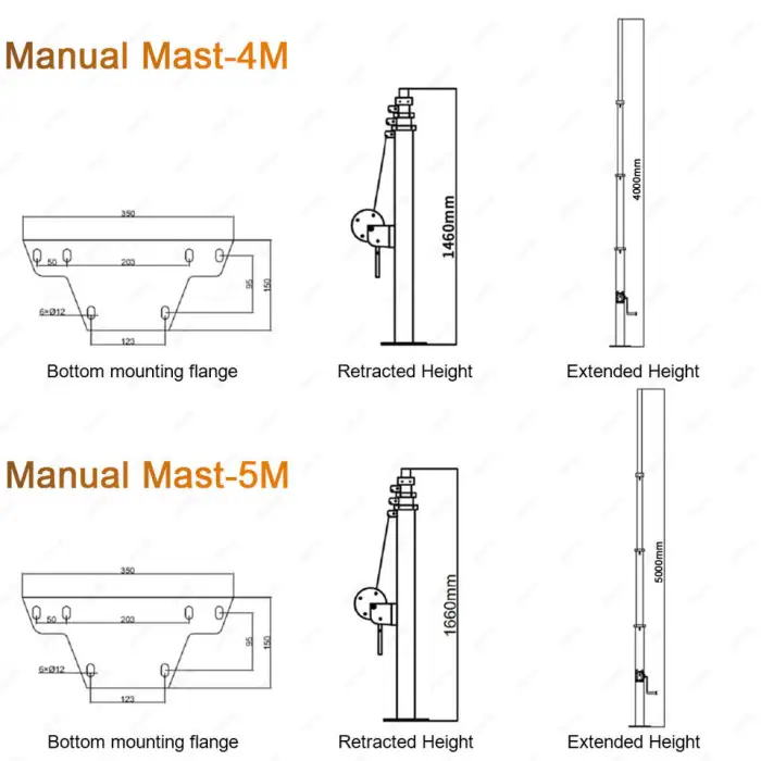 The telescopic mast can reach a height of 5 meters, providing adjustable illumination for various applications.
