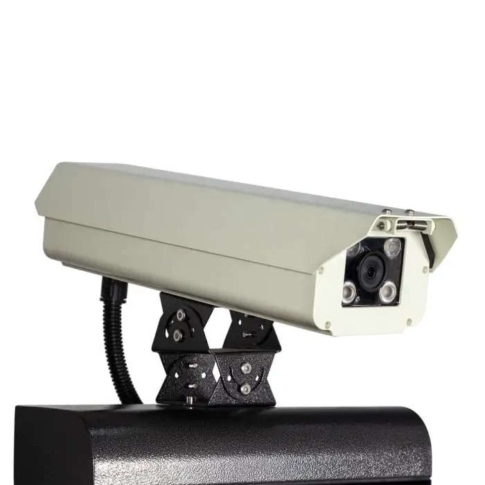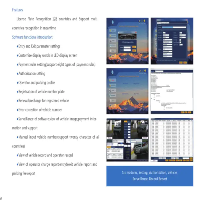 Key features include automated parking guidance, a high-quality 2M pixel camera, TCP/IP communication, durable iron plate metal cabinet, compact dimensions, and an automatic light sensor.