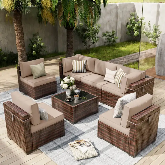 The Outdoor PE Rattan Wicker Sectional Sofa Set features a simple modern style that complements various outdoor aesthetics.