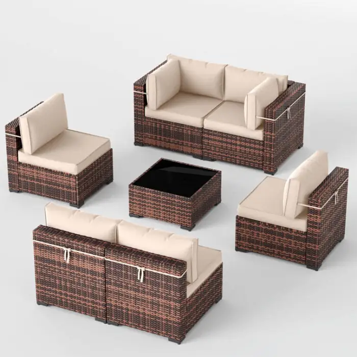The Outdoor PE Rattan Wicker Sectional Sofa Set is made from durable PE rattan material which is UV-resistant, and has a sturdy powder-coated aluminum frame.
