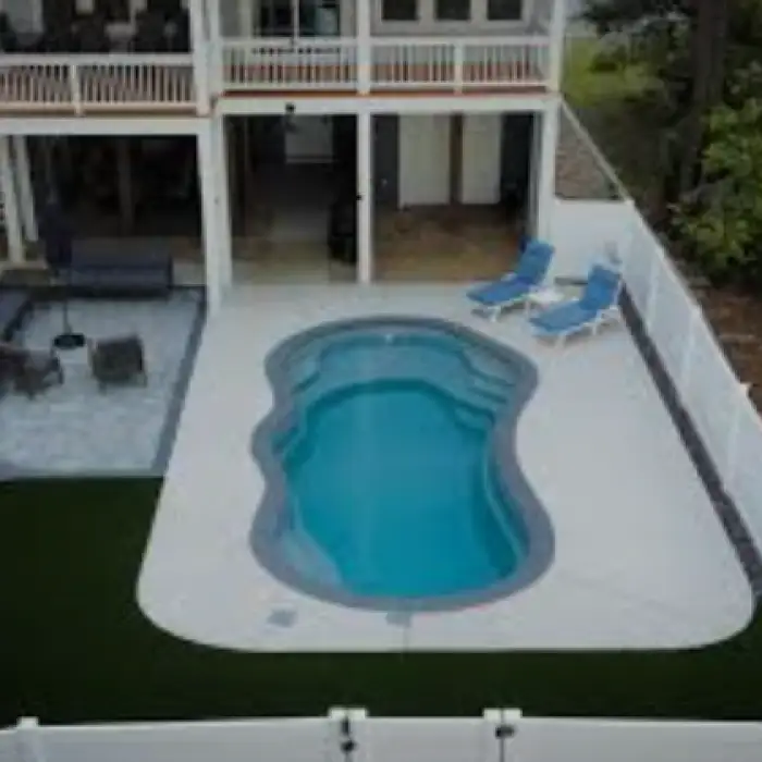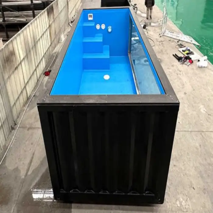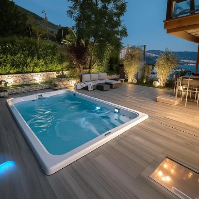 The swimming pool is made from high-quality fiberglass, which ensures durability and long-lasting use.